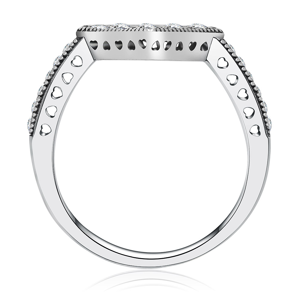 Elegant Square Silhouette Clear CZ Ring crafted from high-quality 925 Sterling Silver with a unique oxidized finish. This striking piece features a geometric design, intricately detailed with cut-out hearts and studded with brilliant clear cubic zirconia stones. A perfect blend of modern design and classic elegance, this ring is an ideal choice for fashion brands and retailers seeking distinctive wholesale jewelry. JR Fashion Accessories offers comprehensive OEM/ODM services for this exclusive design.
