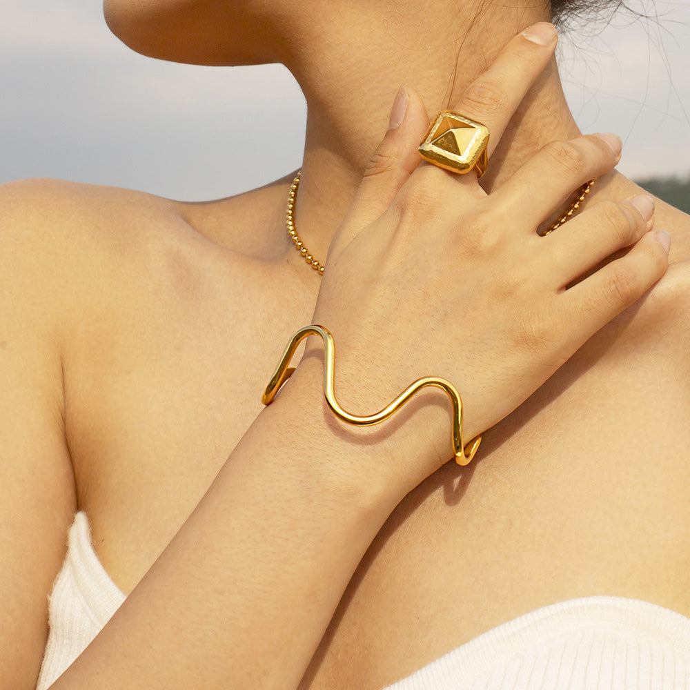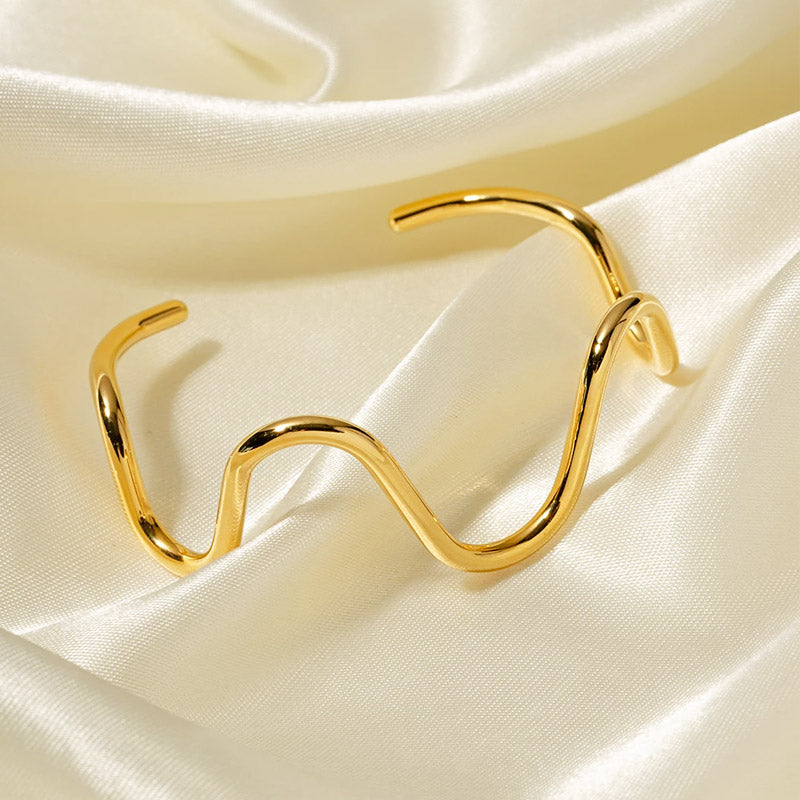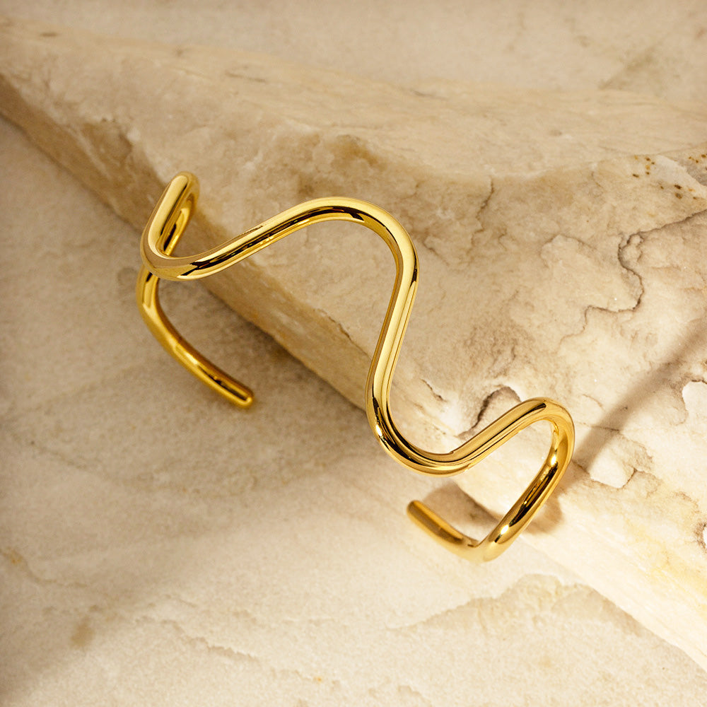 The stainless steel curve wave cuff bangle displayed on a chic marble surface, highlighting its modern design.