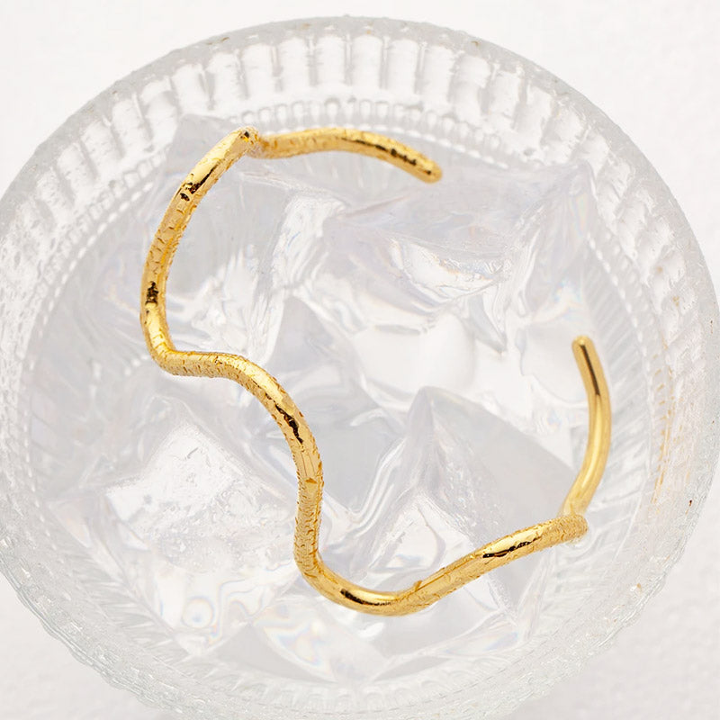 A creative shot of the gold wave cuff bangle in a glass bowl, emphasizing its cool and contemporary appeal.