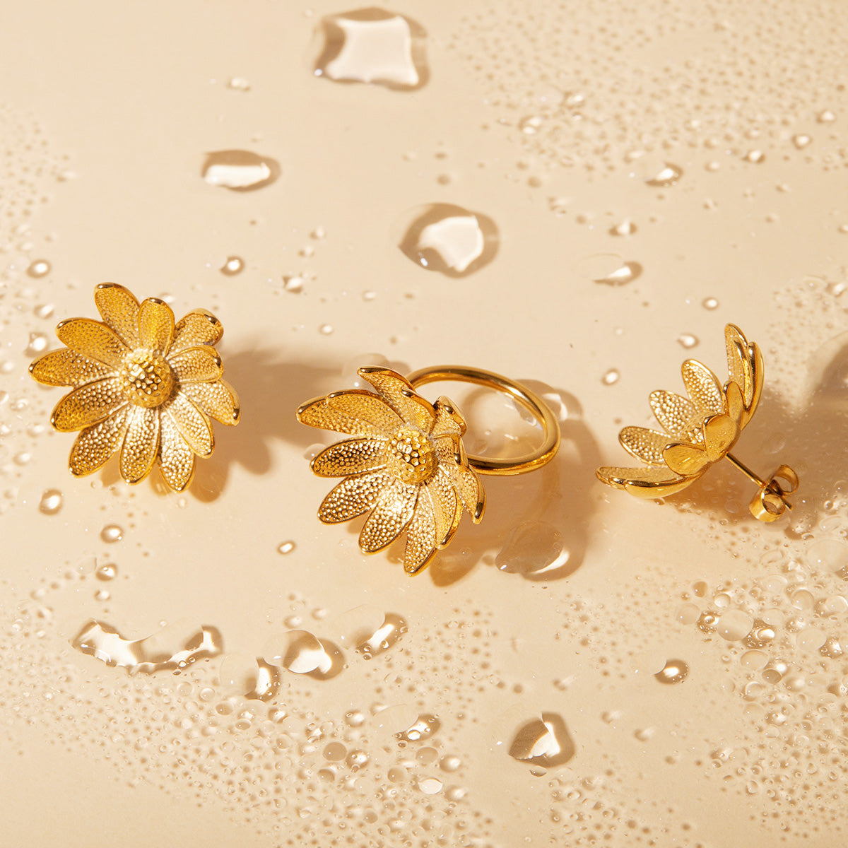 The complete 3D daisy sunflower jewelry set, including rings and earrings.