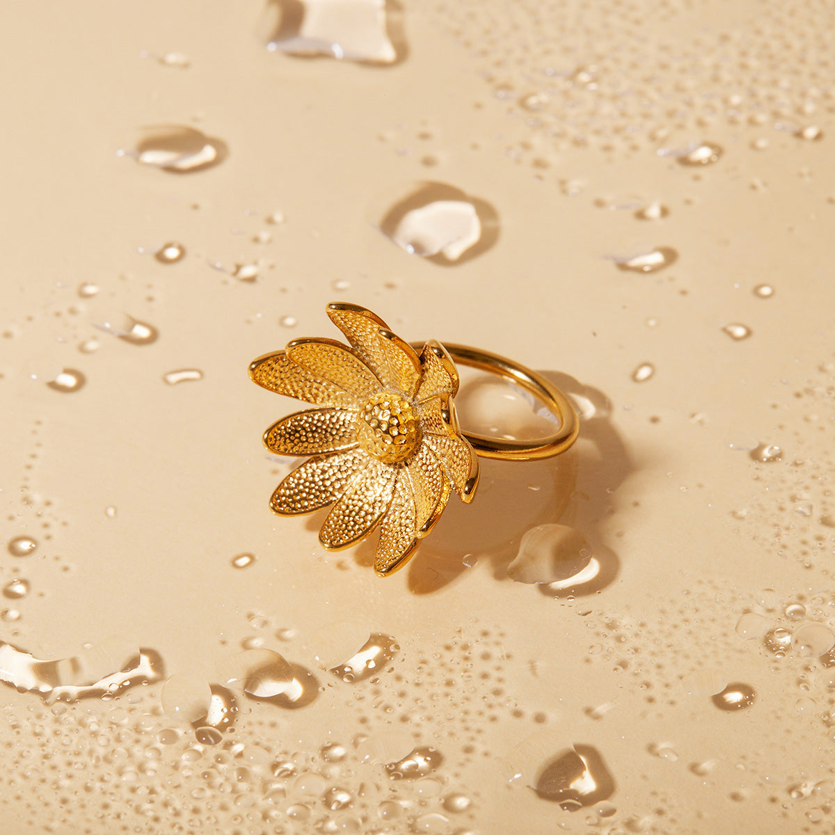 Detailed product shot of the daisy sunflower ring on a neutral background.
