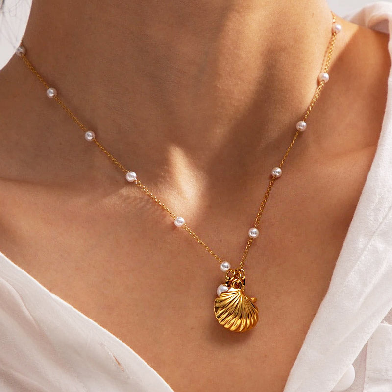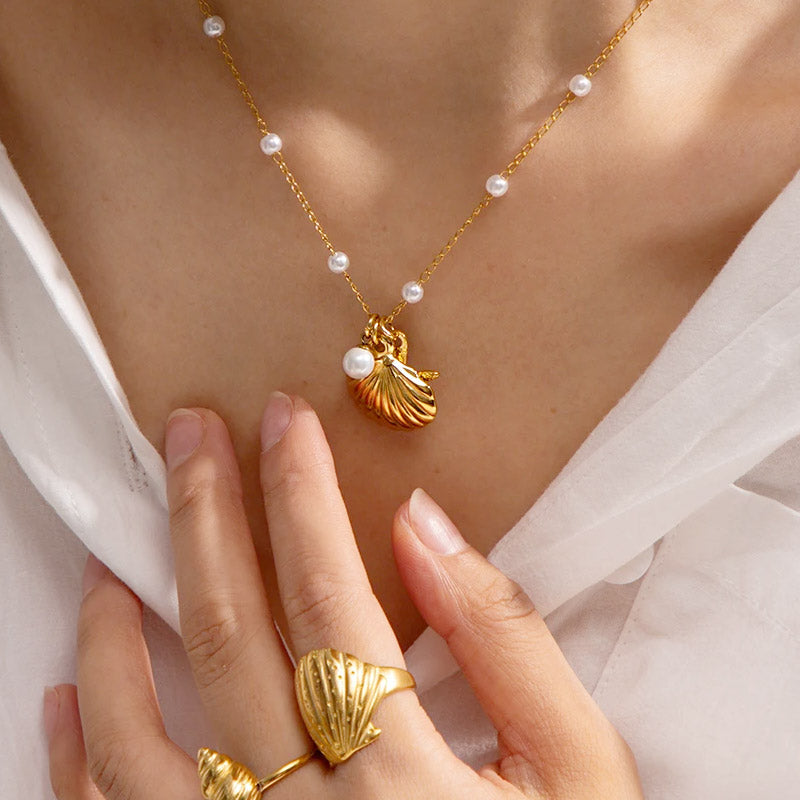 Close-up of the gold seashell pendant necklace with elegant pearl accents on the chain.