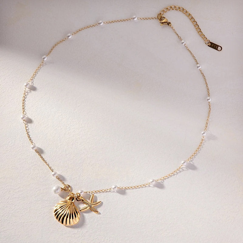 Full view of the gold seashell and starfish necklace, highlighting the small white beads on the chain.