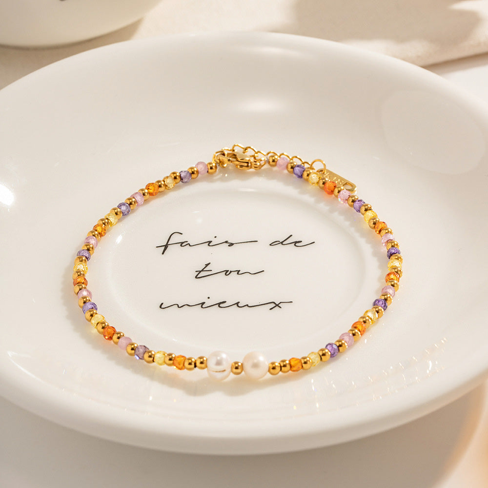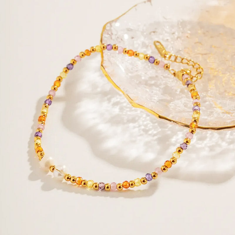 Showcase of a multicolored beaded anklet with pearls, displayed on a decorative plate.