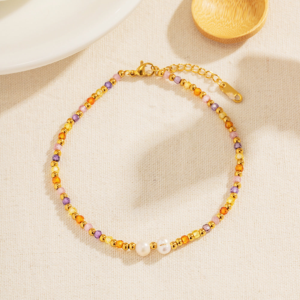 Detailed view of a gold anklet with multicolored beads and pearls from the set.