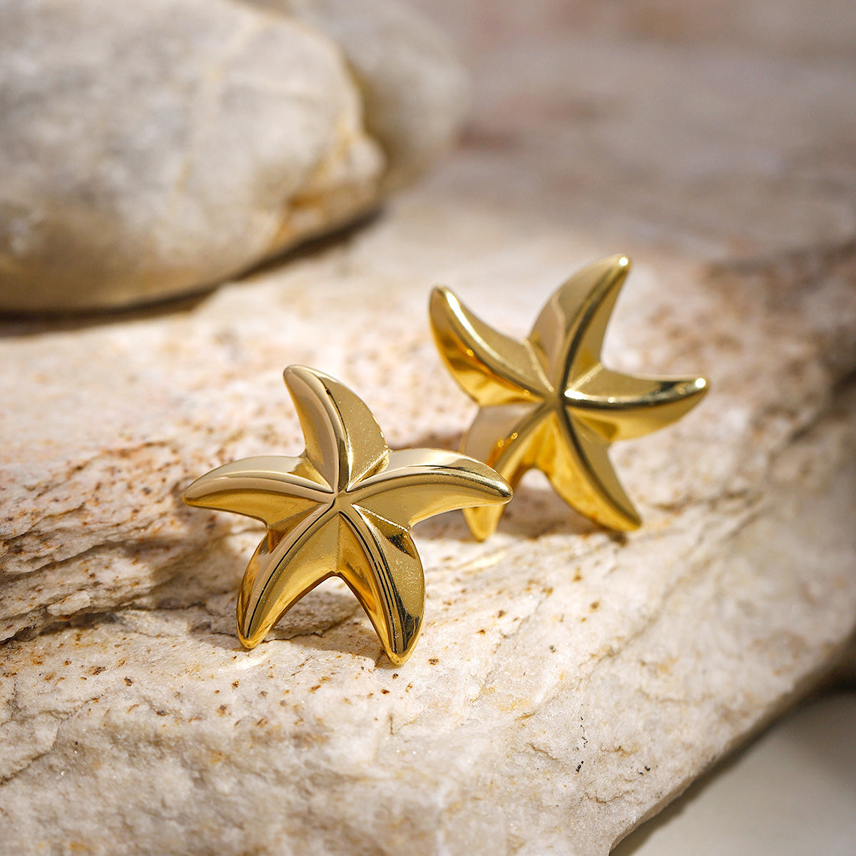 Detailed view of the gold starfish earrings displayed on a textured stone.