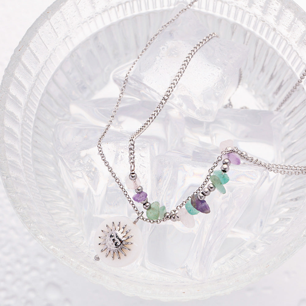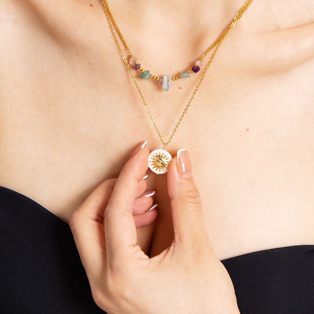 - Design: A chic layered set featuring sun, shell, and colored rock pendants.