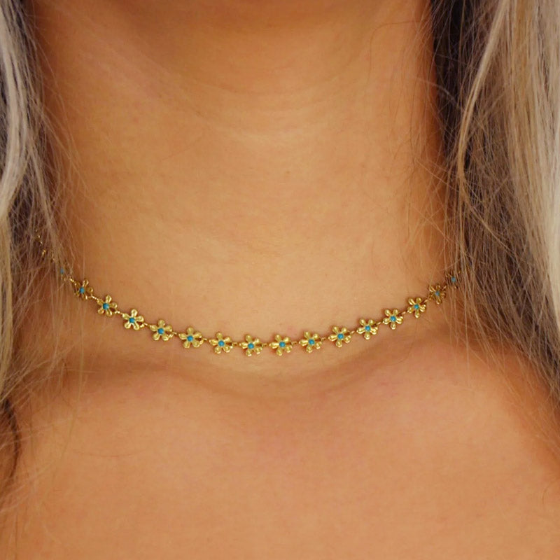 A close-up view of the gold necklace highlighting the turquoise-colored centers of the flower charms.