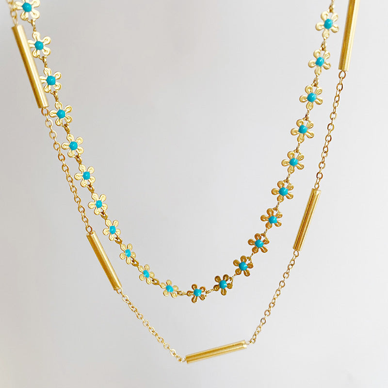 A detailed product shot of the gold necklace with turquoise flower-shaped beads.
