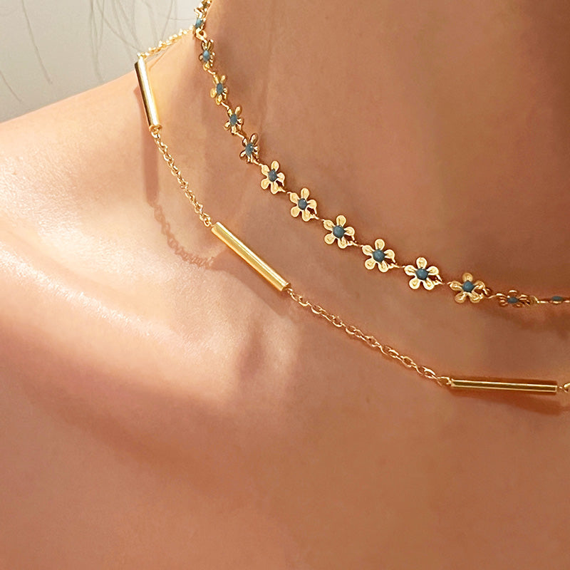 Elevate your accessory collection with this exquisite set of five necklaces, beautifully crafted from premium stainless steel for lasting wear and a brilliant gold-tone shine. Each necklace features charming chamomile flower pendants with a touch of serene blue enamel, offering a fresh and feminine aesthetic. This design combines the timeless appeal of floral motifs with the resilience of modern materials, making it a perfect addition to any jewelry line.