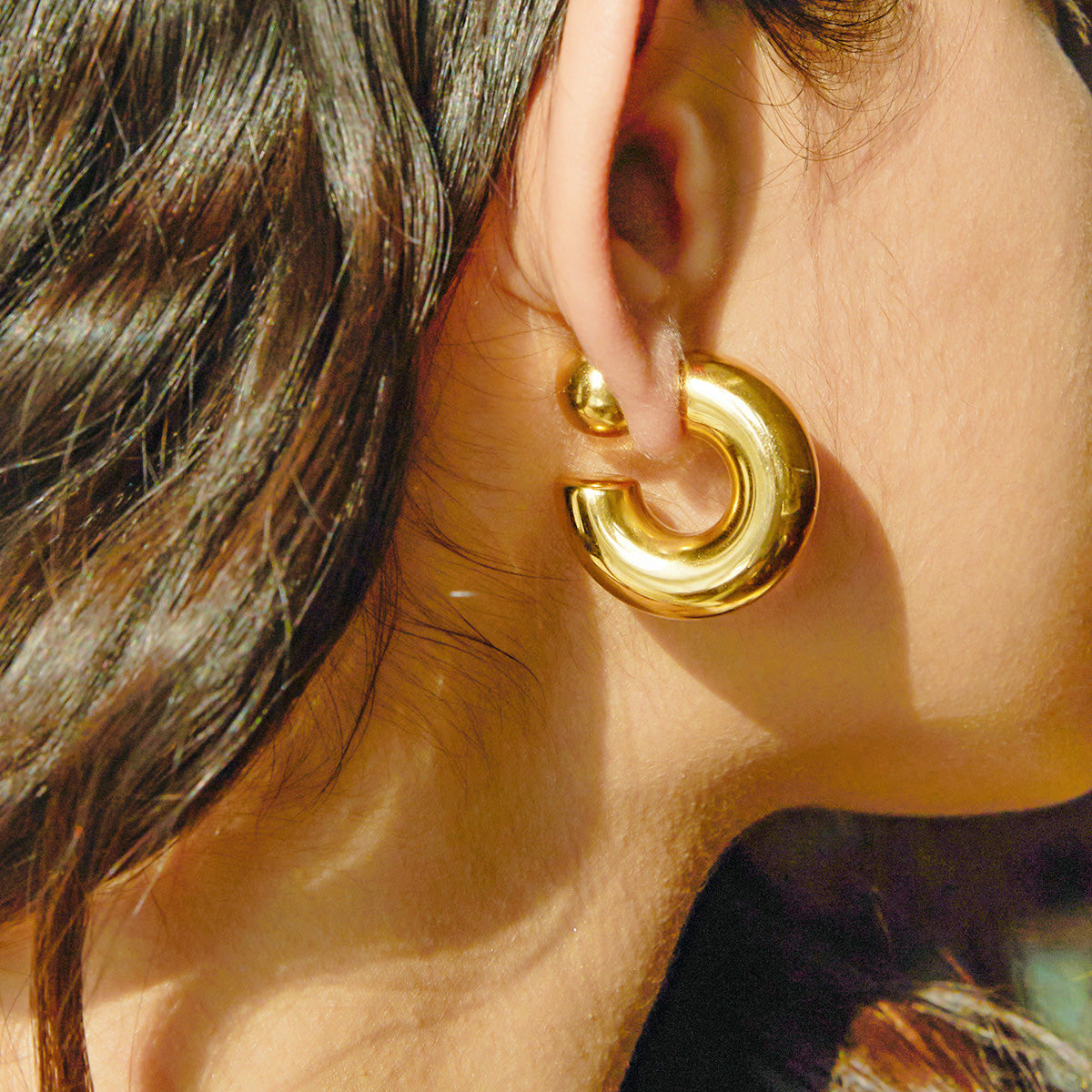 Detailed product shot of the gold chunky ball stud and crescent hoop earring set.