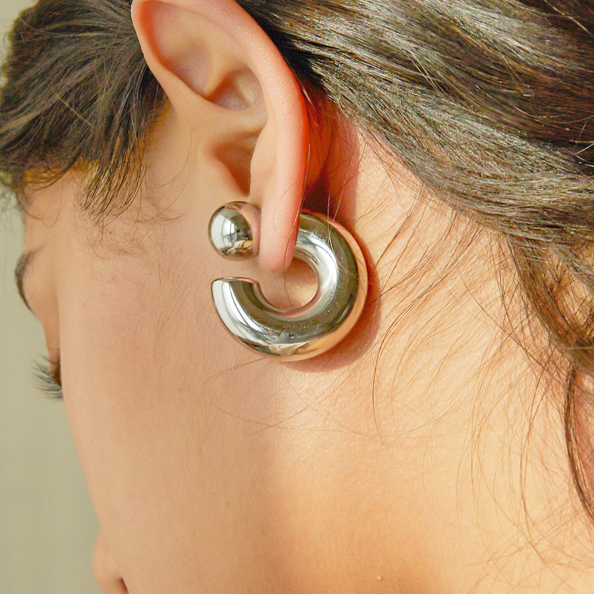 Macro view of the silver crescent-shaped earring, highlighting its polished finish.