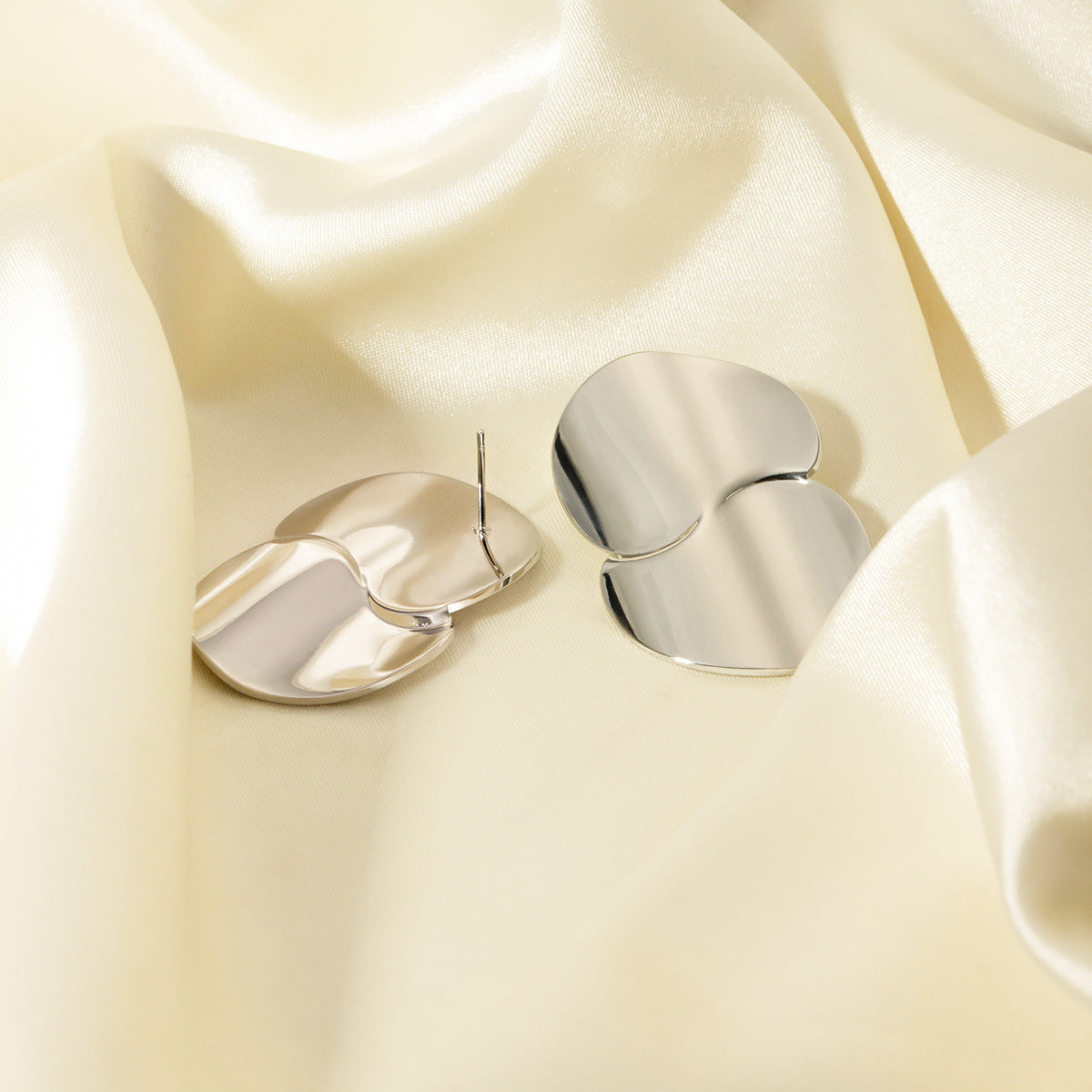 Detailed view of the silver stainless steel disc drop earrings on a satin cloth.