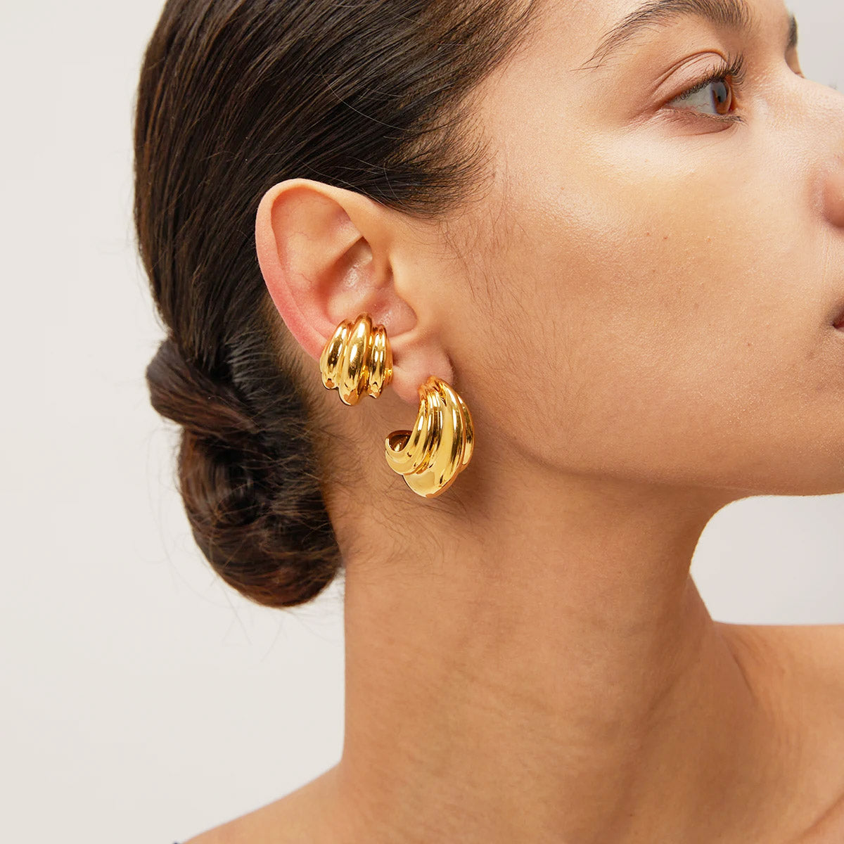 A model elegantly displays the gold chunky hoop earrings, complementing her look.