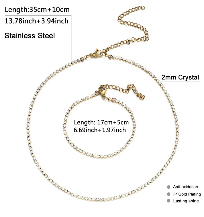 Introducing the JRS-014, a stunning stainless steel jewelry set designed for the modern woman. This elegant ensemble includes a matching necklace and bracelet, both adorned with brilliant crystals that catch the light beautifully. Crafted from durable, high-quality stainless steel, this set is available in luxurious gold or classic rhodium plating, ensuring a lasting shine and resistance to tarnish. The lobster clasp provides a secure and comfortable fit, making it perfect for everyday wear or special occasions.