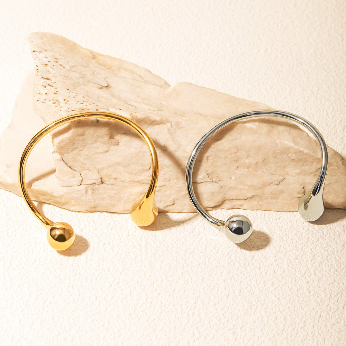 Top-down view of the gold and silver cuff bangles resting on a stone.