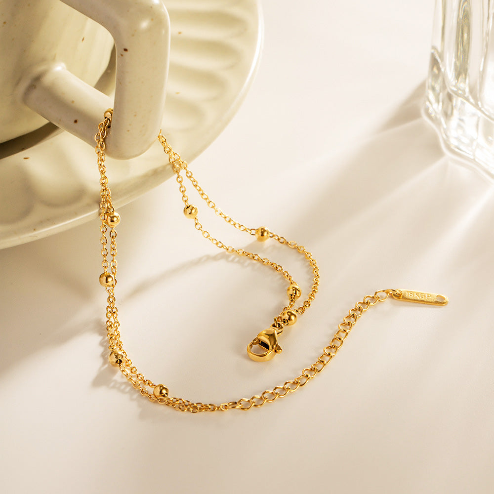 Detailed view of the gold-plated double-strand chain bracelet with small, elegant beads.