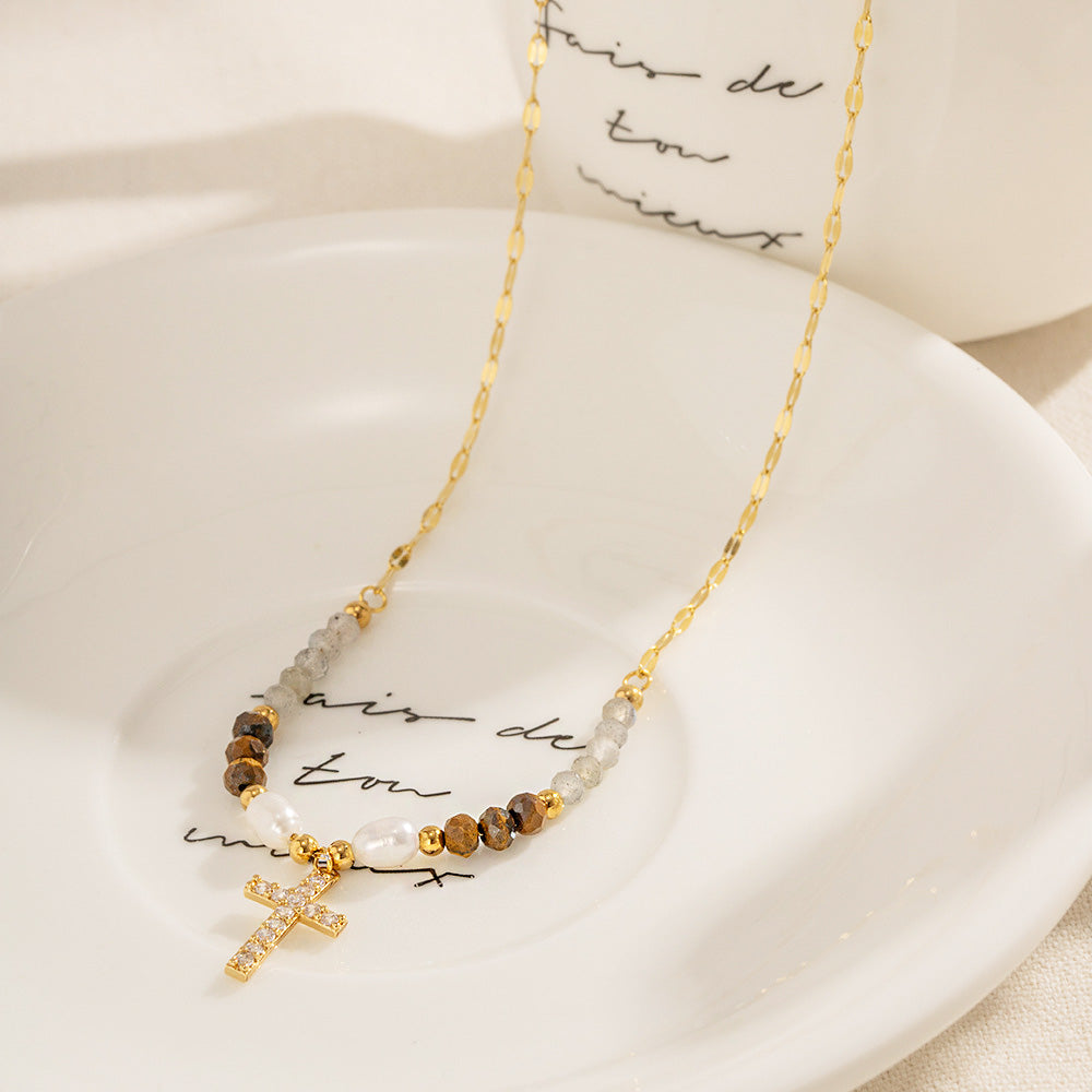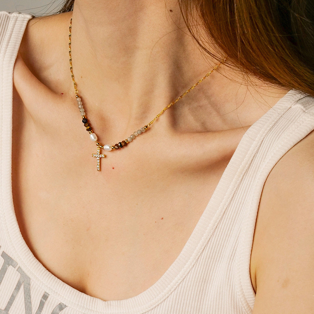 - Product Name: Stainless Steel Dainty Beaded Religious Cubic Zirconia Cross Pendant Necklace