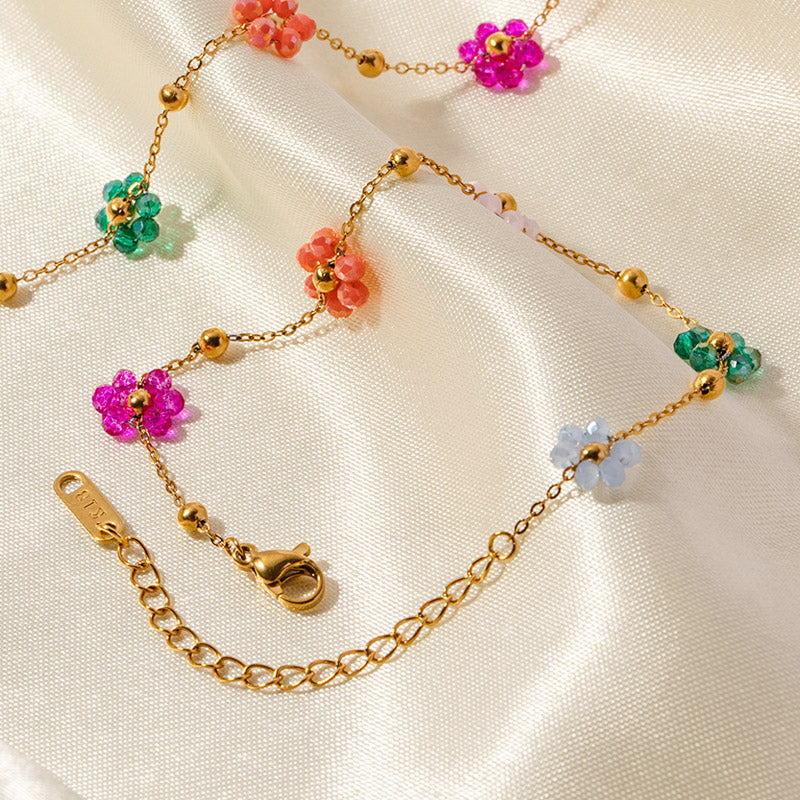Detailed view of a gold chain bracelet with vibrant, multi-colored flower-shaped beads.
