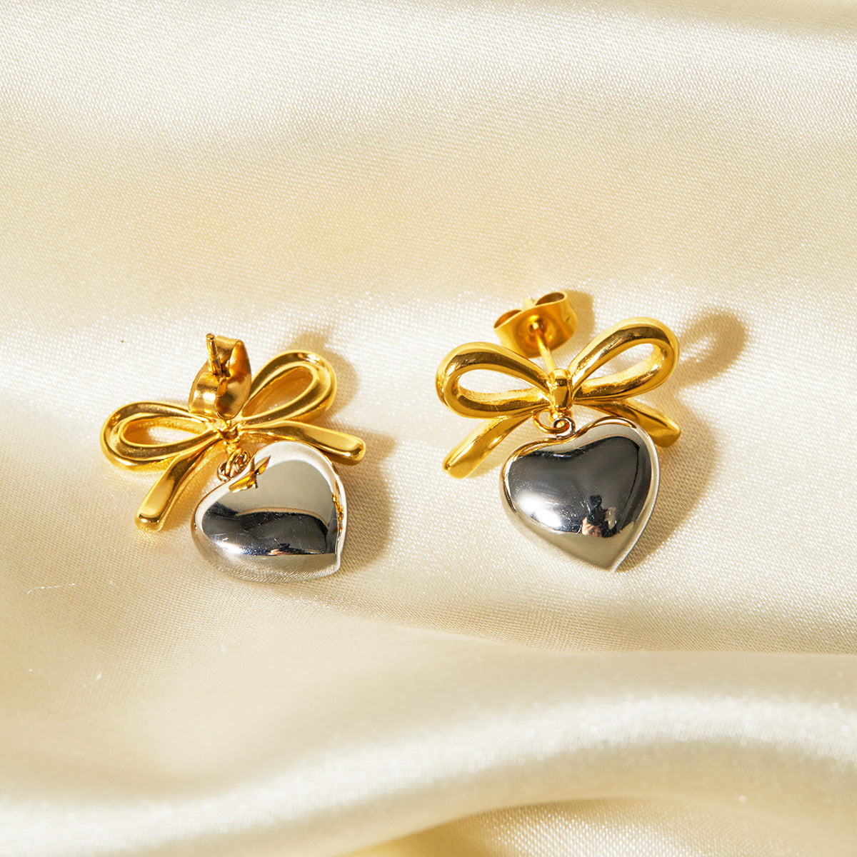 A pair of two-tone heart-shaped earrings with gold bows and silver hearts.