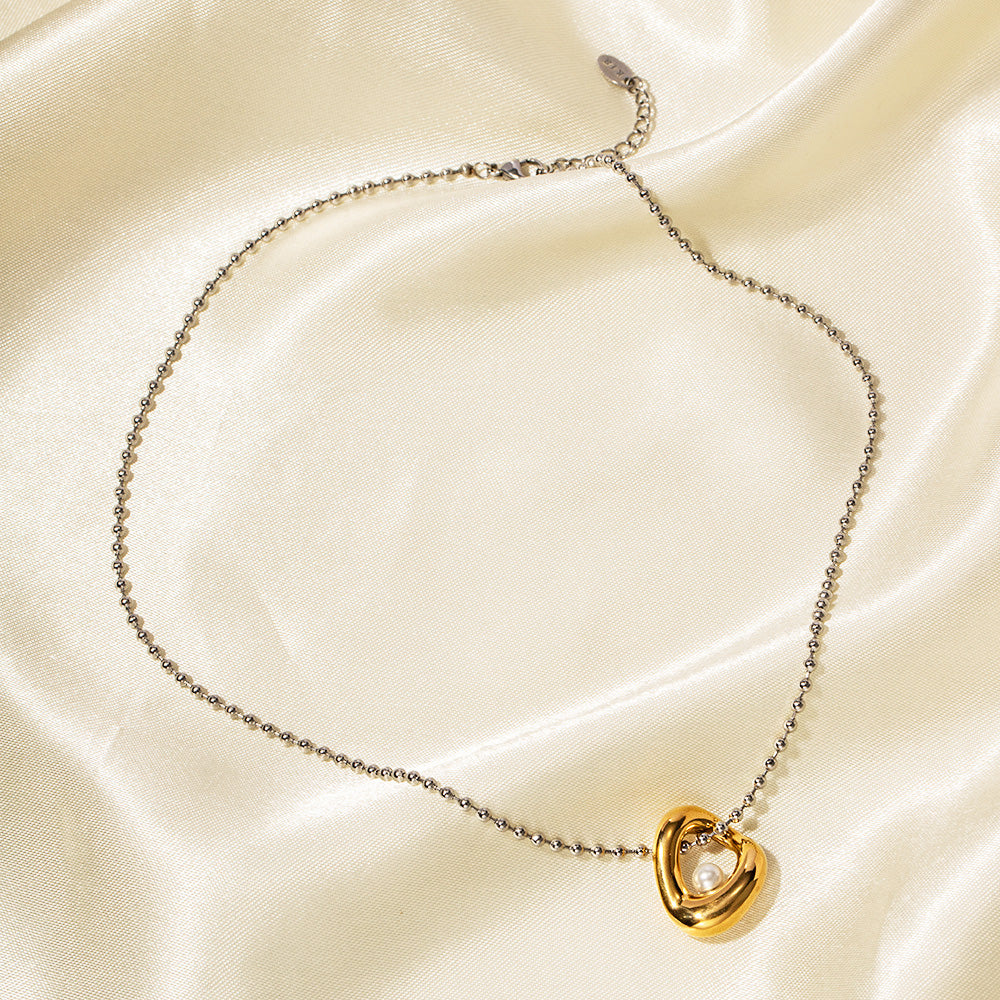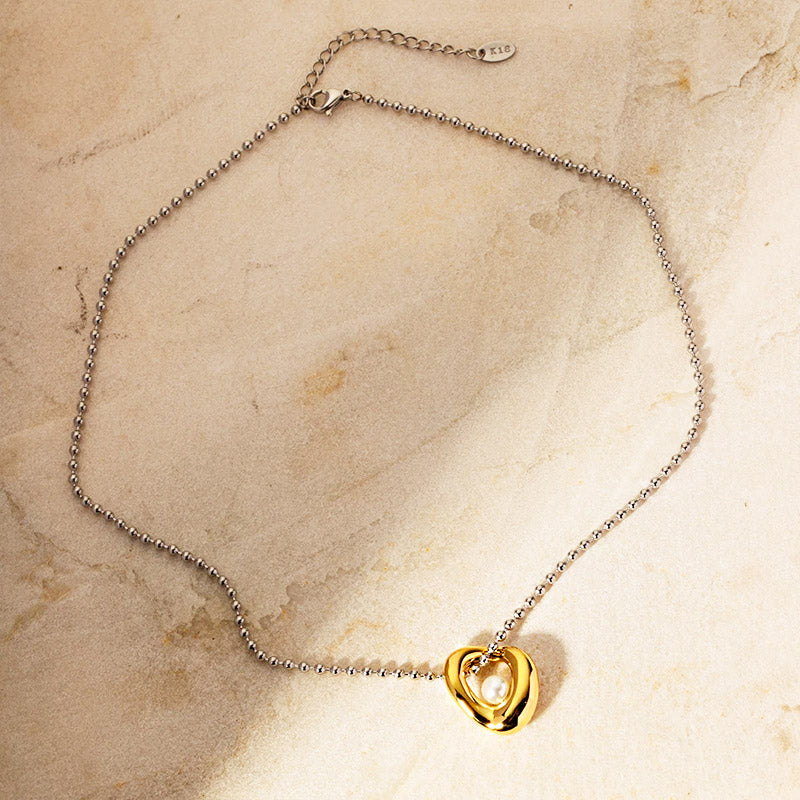 Silver chain necklace with a gold heart-shaped pendant and pearl.