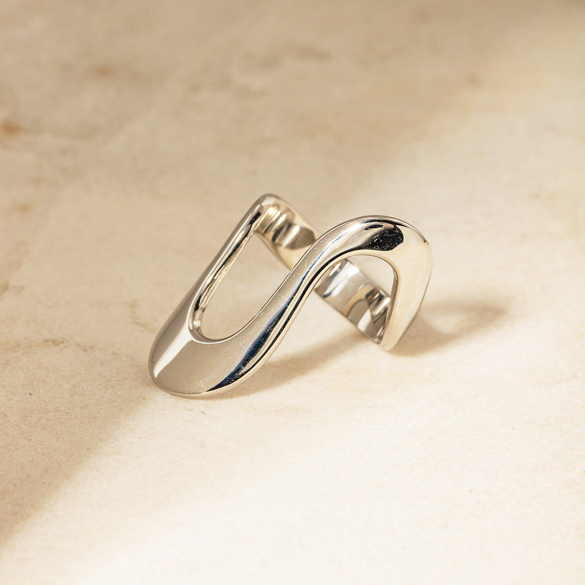 A woman's hand wearing a gold S-shaped geometric ring from the stainless steel set.