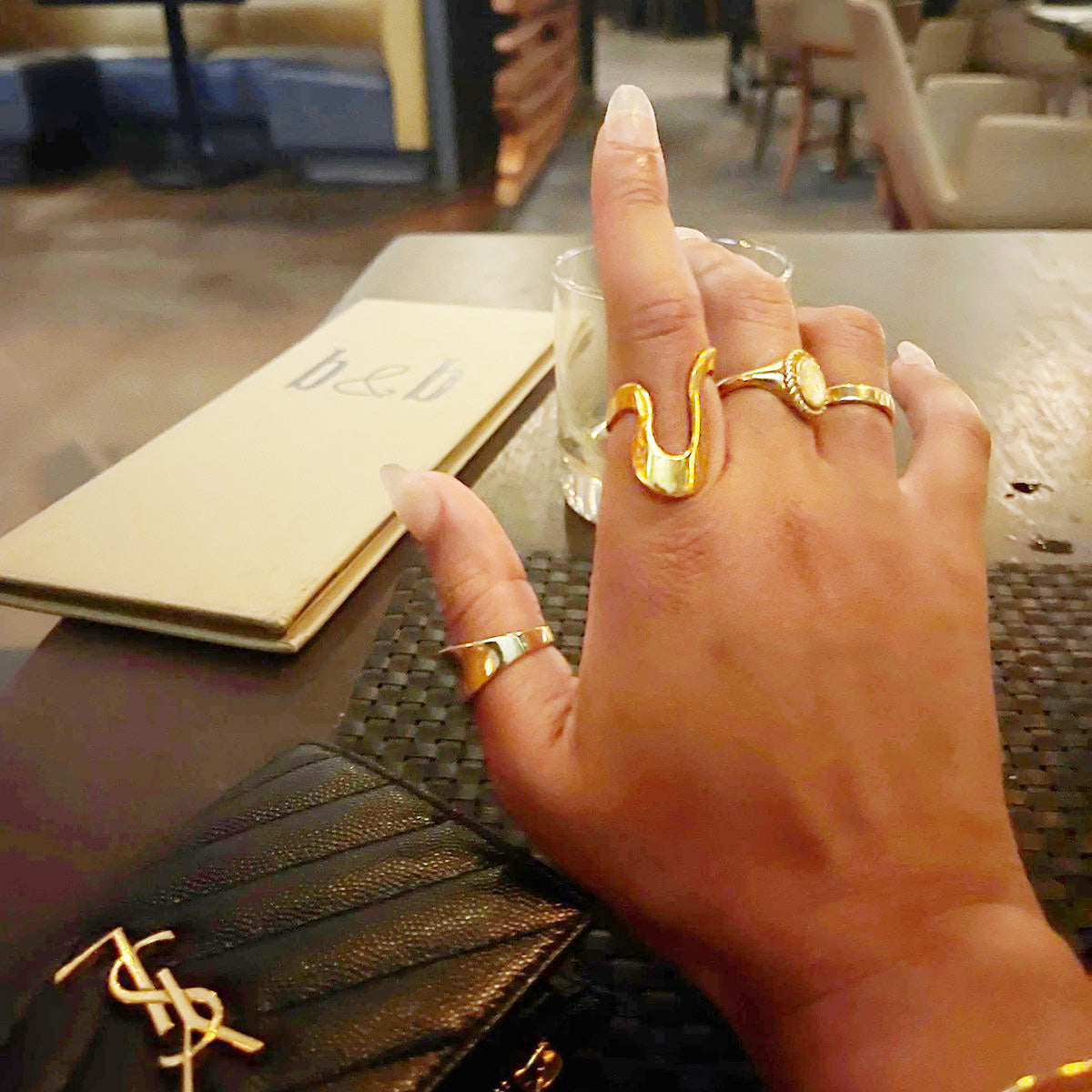 Lifestyle image showing the geometric gold rings paired with a luxury purse in a cafe setting.
