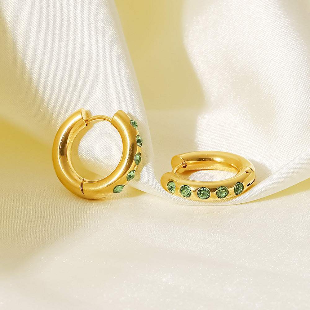 Elevate your accessory collection with these stunning stainless steel hoop earrings. Featuring a brilliant gold-plated finish and sparkling 20mm cubic zirconia stones, these earrings offer a perfect blend of durability and elegance. Available in a variety of vibrant colors including green, pink, and classic white, they are designed to complement any style. Crafted from high-quality, hypoallergenic stainless steel, these hoops are perfect for everyday wear or special occasions. Ideal for fashion brands and retailers looking for trendy, high-quality wholesale jewelry.