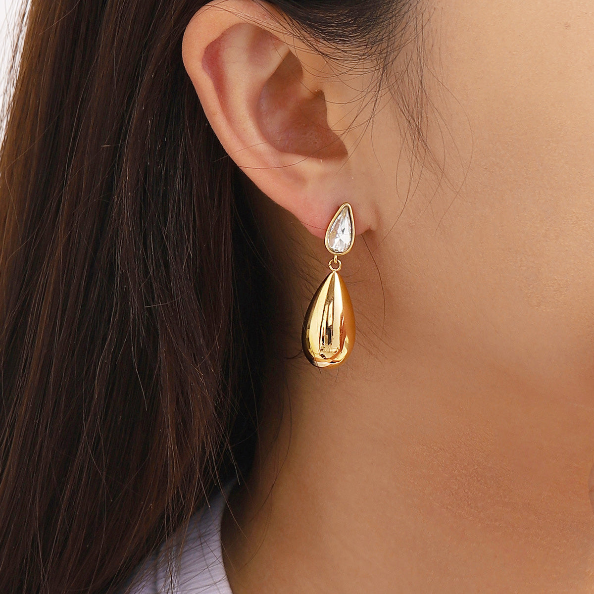 Close-up of a single gold teardrop earring highlighting the clear crystal detail.