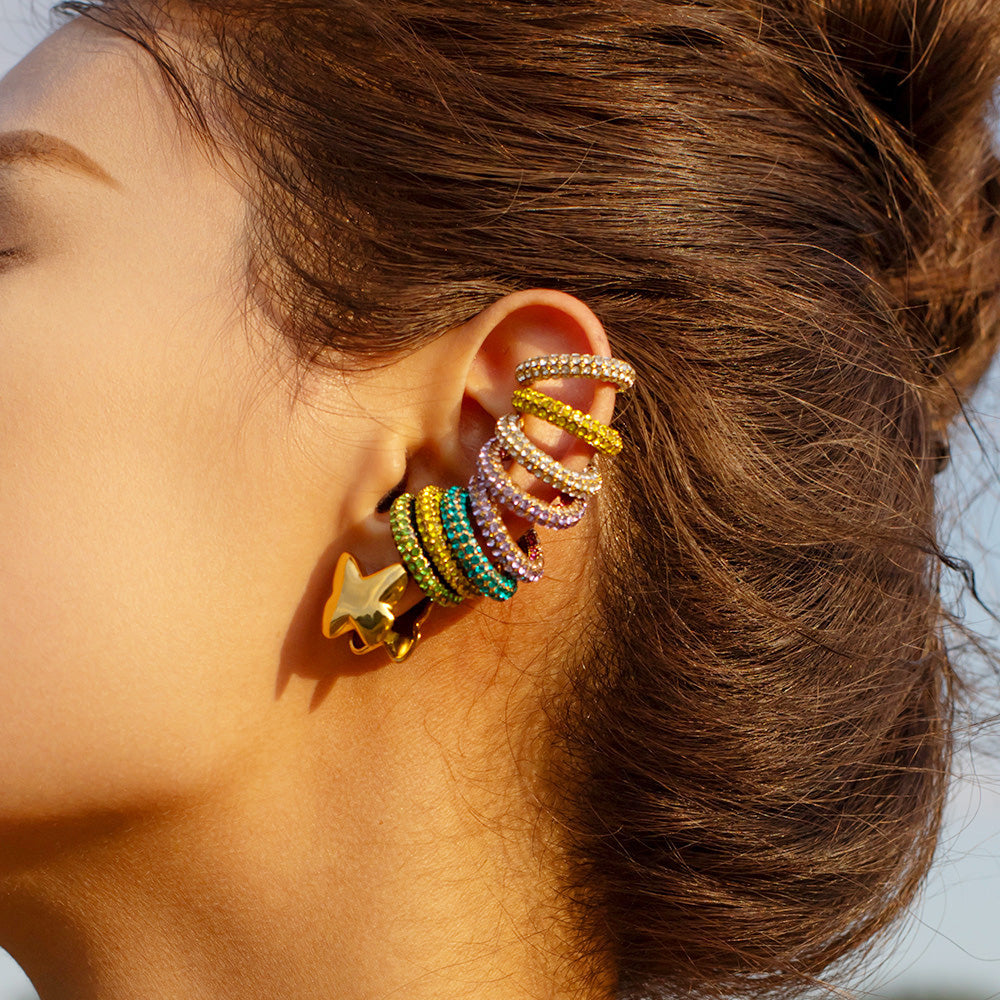 A model's ear adorned with a variety of colorful rhinestone ear cuffs, demonstrating how to style the set.