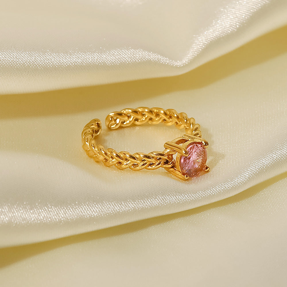 Close-up of the adjustable open ring with a charming pink cubic zirconia stone.