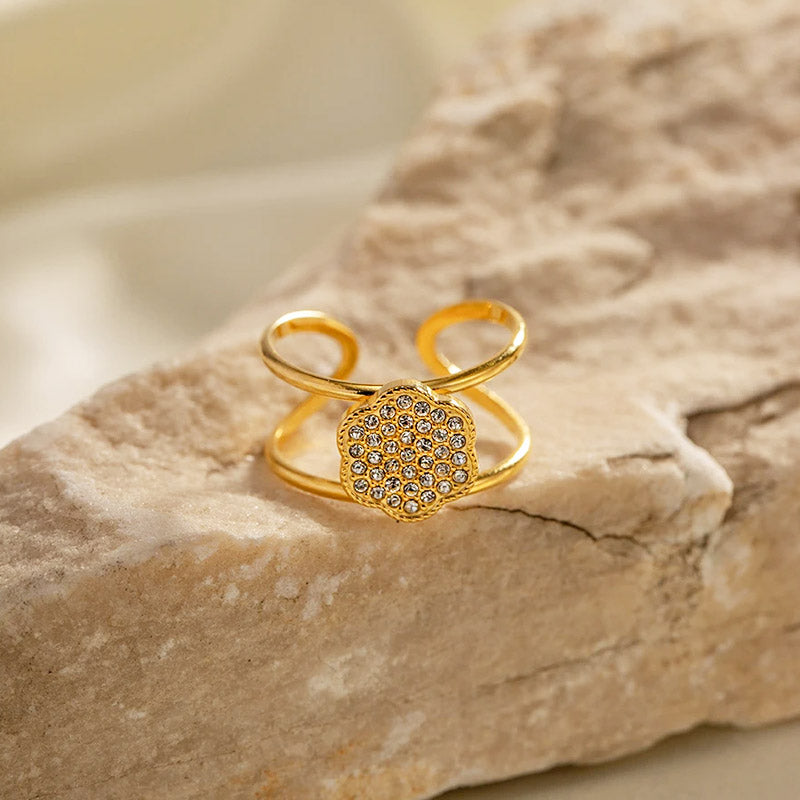 Close-up of a gold-plated ring with a delicate flower design paved with cubic zirconia.
