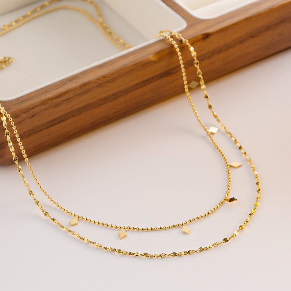 A gold double-strand necklace with intricate diamond-shaped beads.
