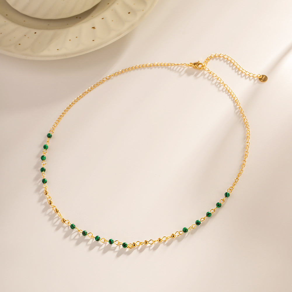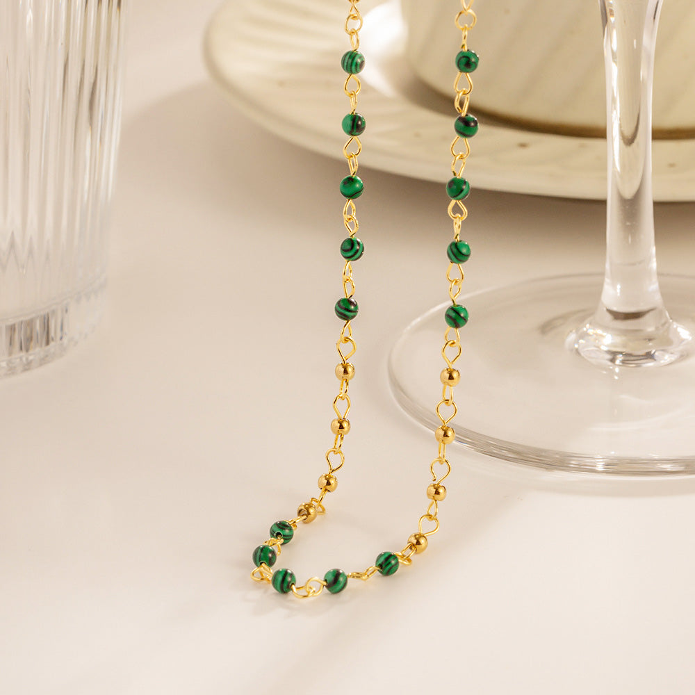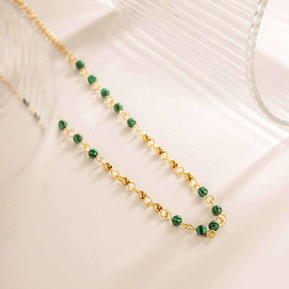 Close-up view of the delicate green beads and gold chain of the stainless steel necklace.