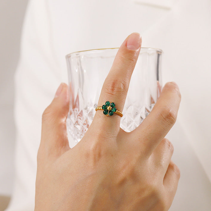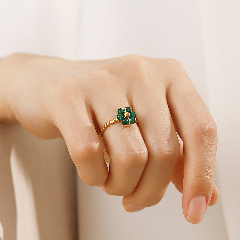 - Product Name: Stainless Steel Gold Green Natural Stone Flower Open Rings