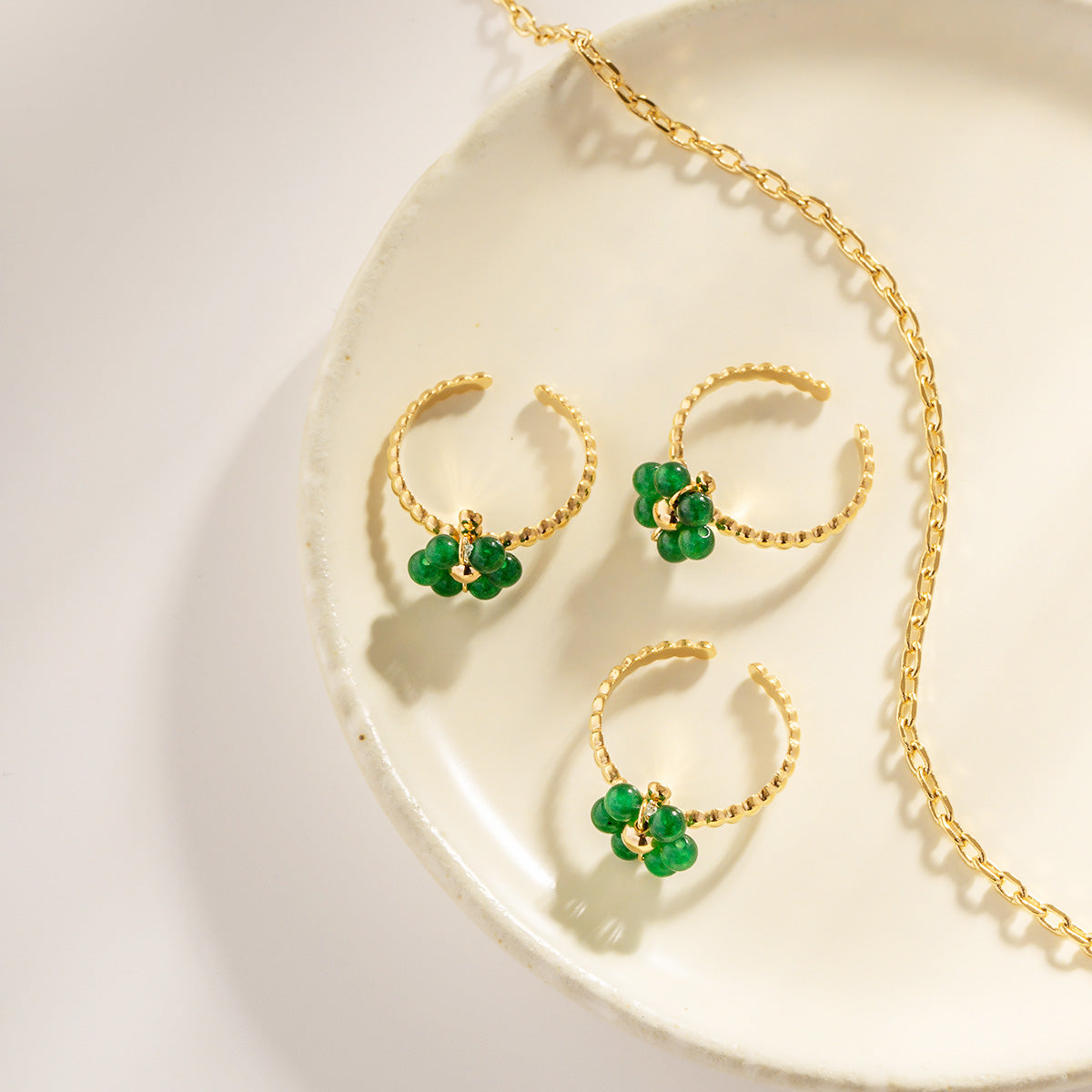 A model wearing a gold flower ring with green gemstones from the set.