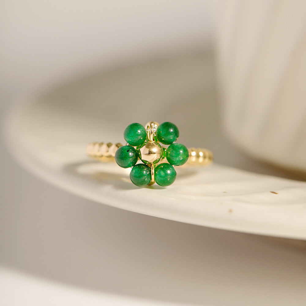 - Design: A curated set of five open rings with unique green natural stone flower designs.