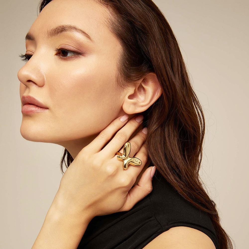 Close-up of the gold butterfly ring on a white marble surface.