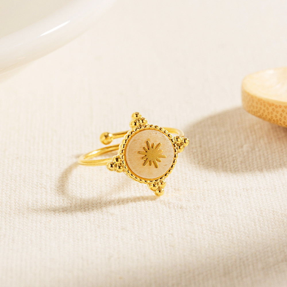 Another design from the adjustable ring set, featuring a beige stone with a delicate flower motif.