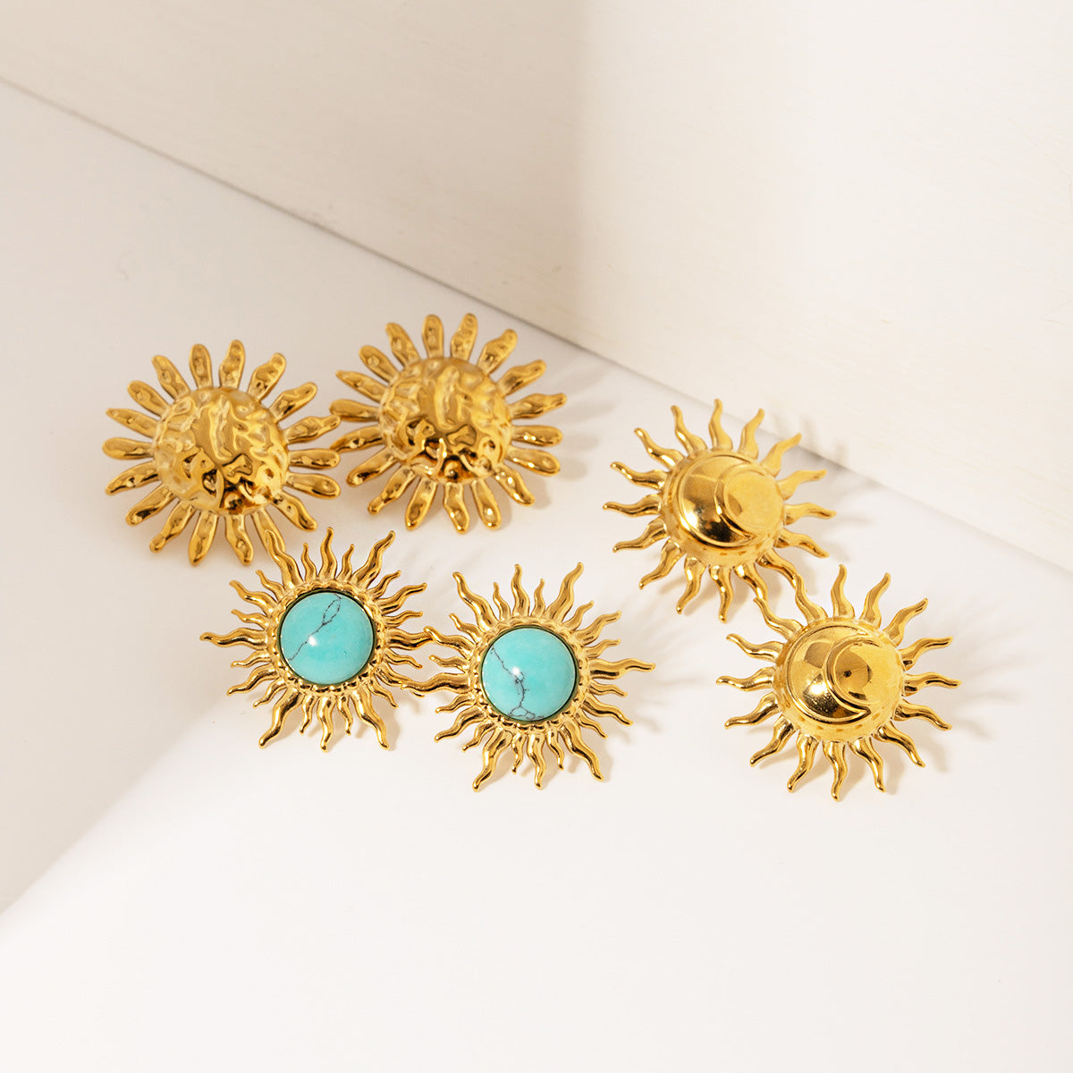Various styles of gold sun-shaped stud earrings, including hammered texture and turquoise stone designs.