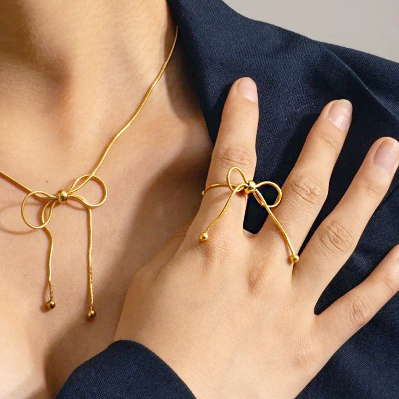 Elevate your accessory collection with this charming set of five adjustable bowknot rings. Crafted from high-quality stainless steel with a durable gold PVD finish, these rings offer a perfect combination of style and longevity. The unique bow design with delicate dangling elements adds a playful yet sophisticated touch, making them ideal for daily wear or special occasions. Their adjustable nature ensures a comfortable fit for everyone. Perfect for retailers and fashion brands seeking unique, high-quality wholesale jewelry.