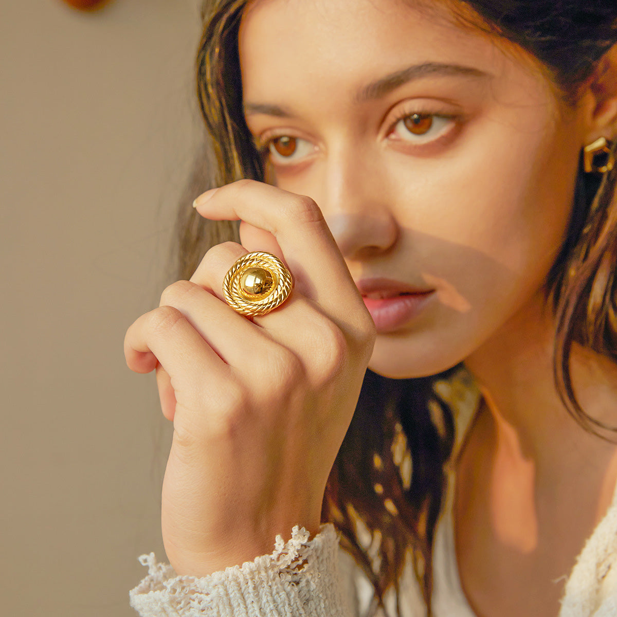 Another ring from the set, highlighting a rope-like texture surrounding a central gold ball.