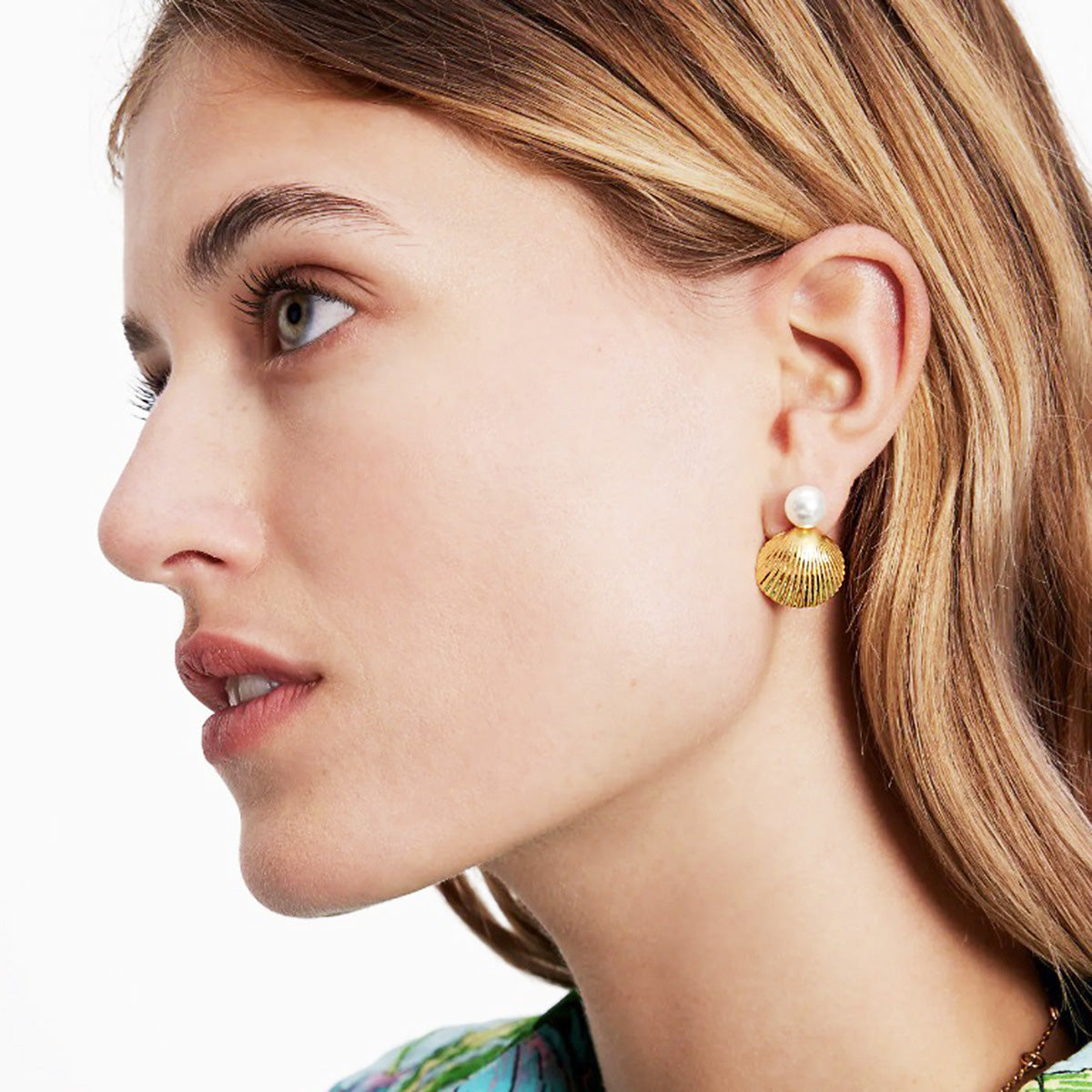 Elegant display of the gold shell earrings with pearl tops.