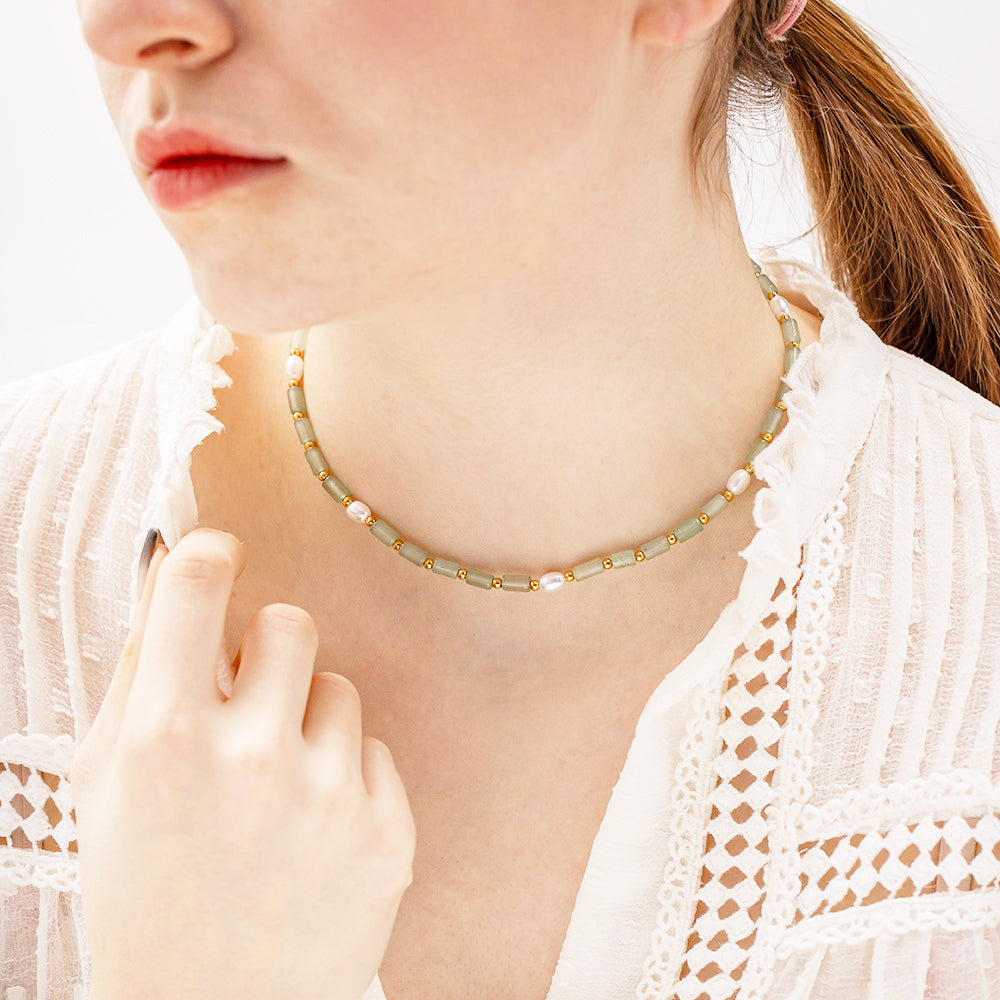 A delicate and minimalist green beaded necklace with pearls and gold details, perfect for layering.