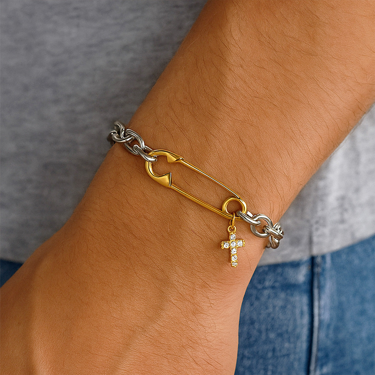 This bold and stylish link chain bracelet is crafted to elevate modern streetwear and everyday looks. Featuring a studded cross pendant with sparkling zircon stones, this piece combines edgy details with the luxurious shine of PVD gold plating. The unique safety pin link structure adds an industrial-inspired touch, making it a standout accessory. Whether worn solo or layered, it’s a must-have design that brings both visual impact and personal meaning.