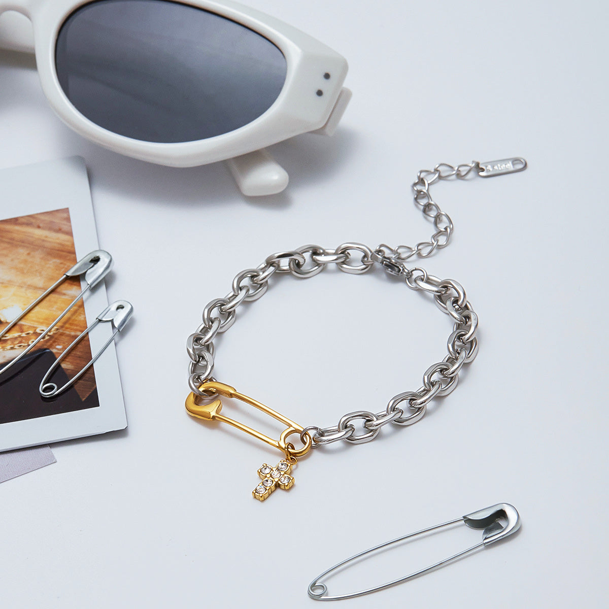 - Detailed close-up of the zircon-studded cross charm and safety pin link on the stainless steel bracelet.