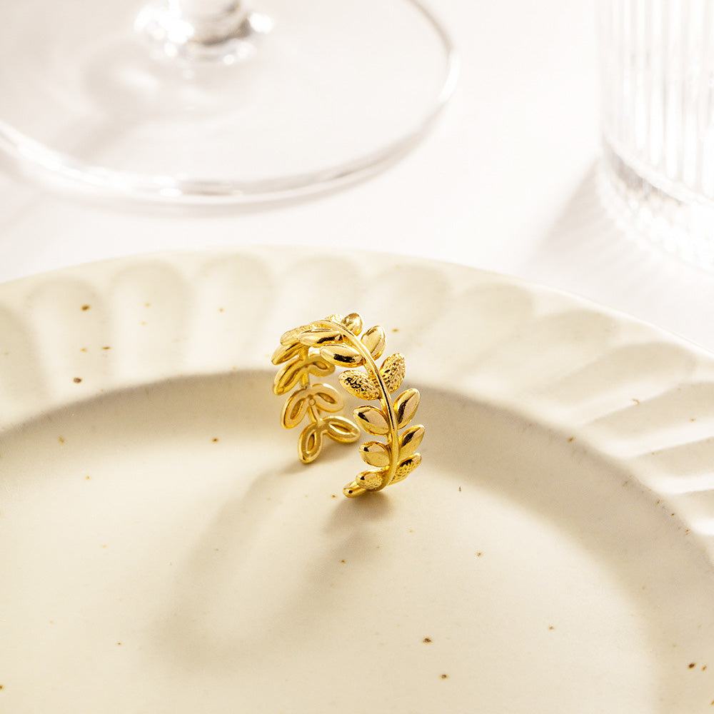 Detailed studio shot of the stainless steel olive branch leaf ring in gold.