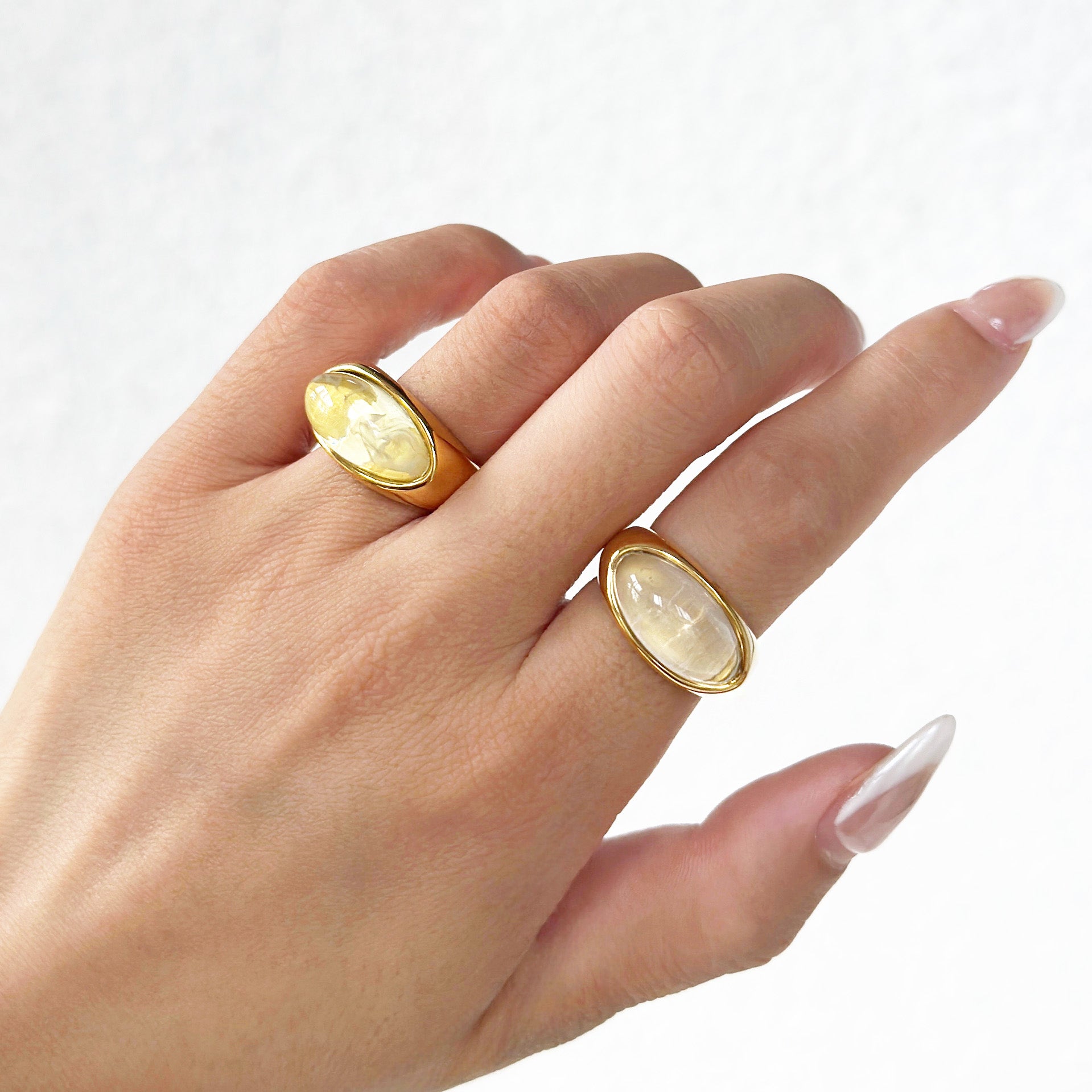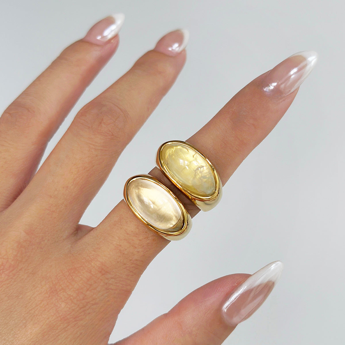 A pair of stainless steel rings with vibrant yellow oval gemstones, showcasing the set's color variety.