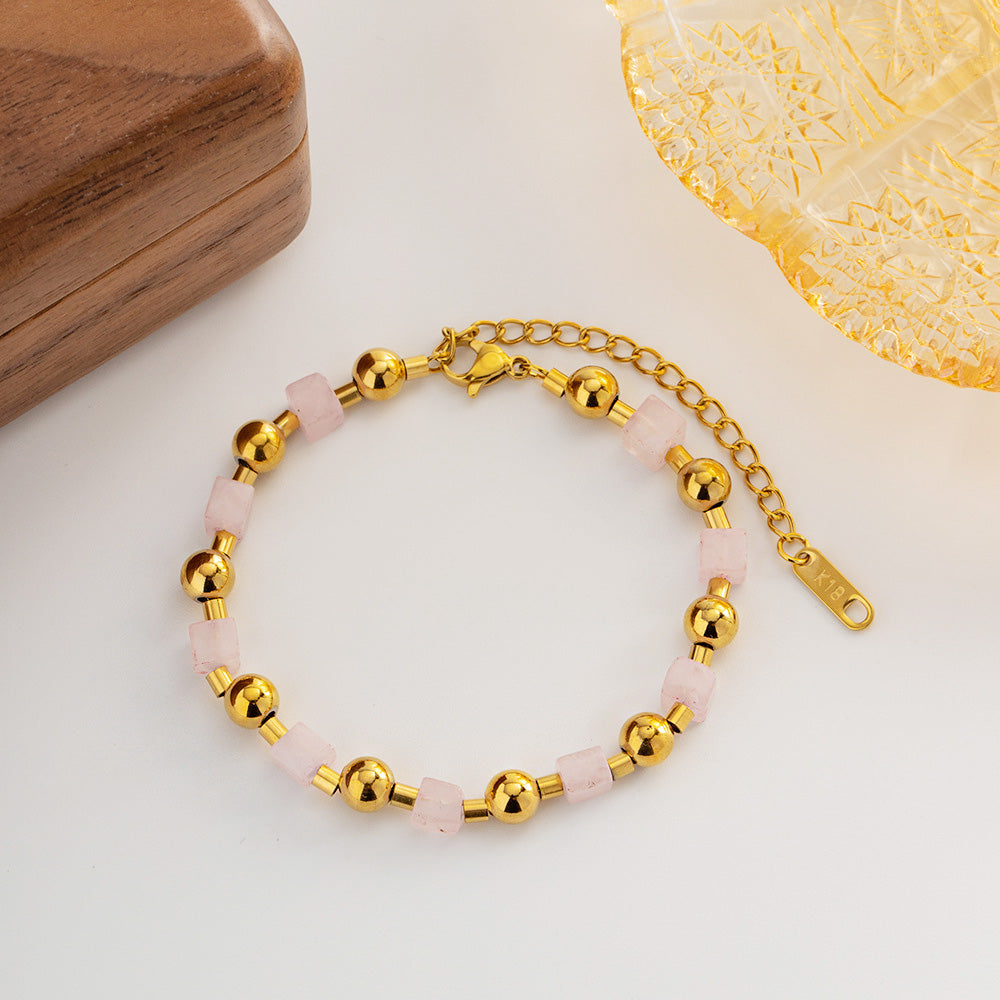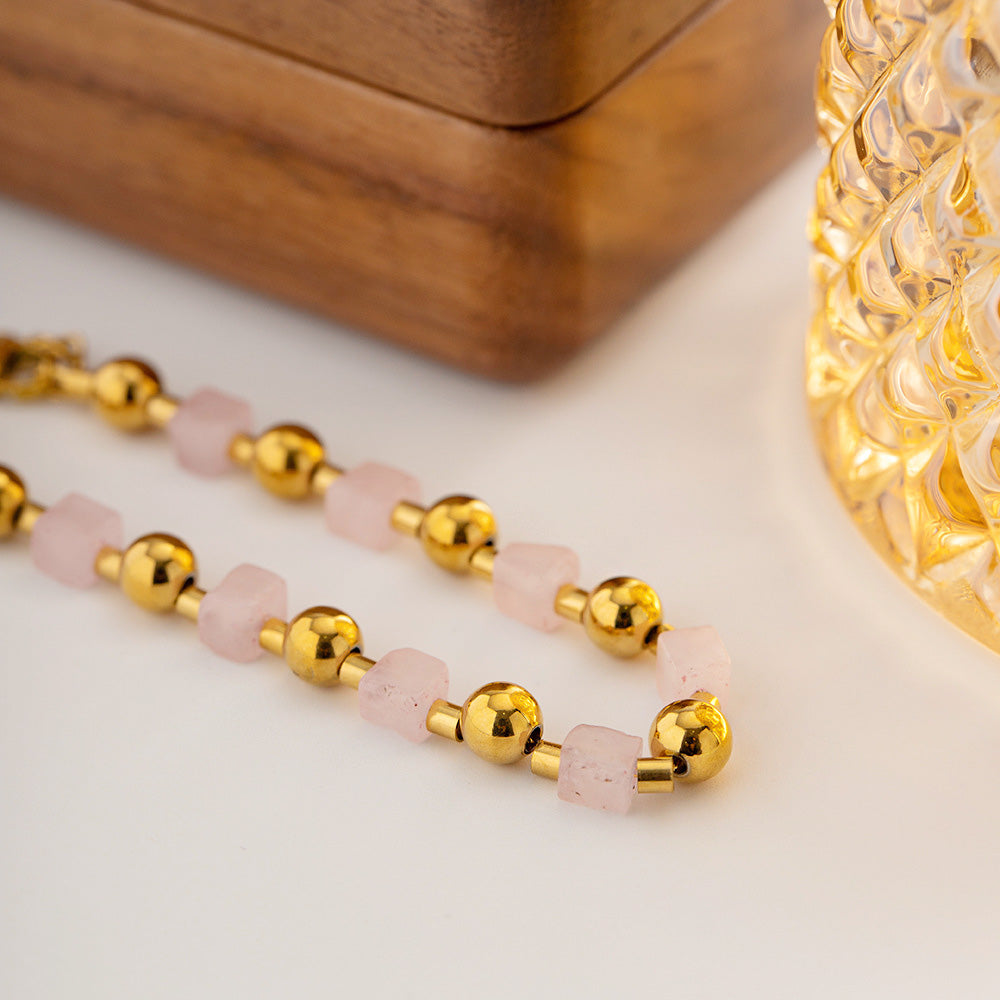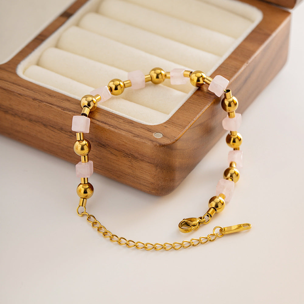 - Elegant Design: Features a harmonious blend of natural pink stones and polished gold-tone stainless steel.