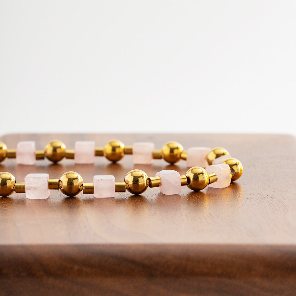 This bracelet set is a testament to modern design and timeless appeal. The combination of the soft pink hue from the natural stones and the warm glow of the gold-tone finish creates a feminine and sophisticated accessory.